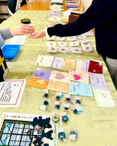 会場入口ではミニバザーを開催。校章入りの品々や刺繍の施されたクリスマスカードなどバザー委員会による温かみあふれる製作品が並び、参加者は思い思いの品を手に取っていました。